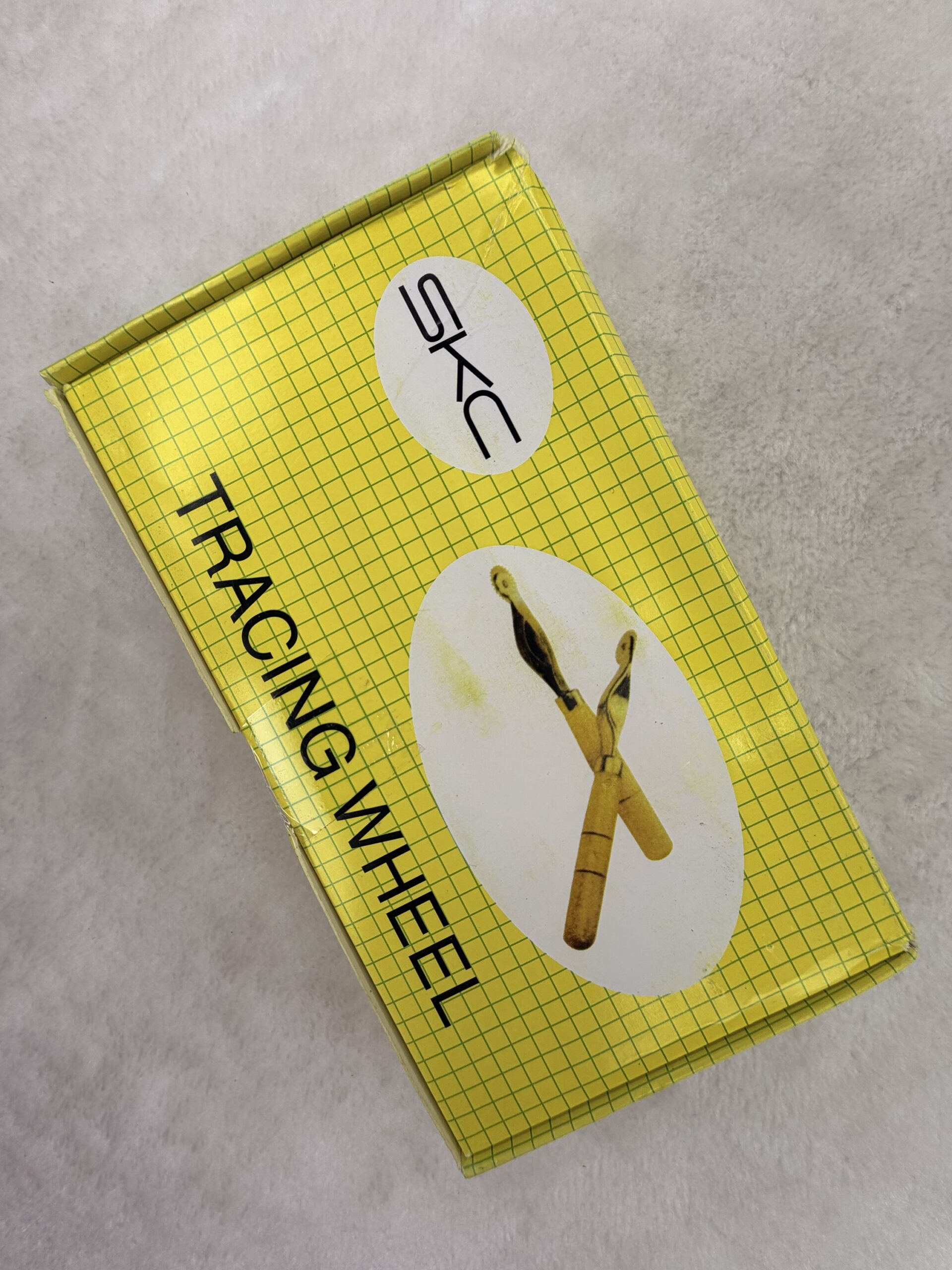 This is a retail box for an SKC Tracing Wheel, an essential tool for sewing, tailoring, and pattern making. The box is bright yellow with a grid pattern and features two oval inserts displaying an image of the tool, which has a wooden handle and a serrated metal wheel. A tracing wheel is used to transfer pattern markings from tissue paper or cardboard onto fabric using carbon paper underneath, or directly onto heavy fabrics or leather to mark seam allowances, darts, and pocket placements.
