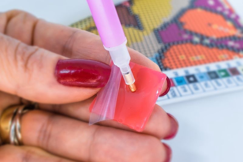 This tool is the classic choice for diamond painting enthusiasts. It consists of a hollow-tipped metal nib attached to a lightweight handle. Unlike wax pencils, this pen is “charged” by pressing the tip into a square of adhesive wax (shown in the pink pad). The wax fills the hollow tip, creating a suction-like grip that allows you to pick up resin diamonds and place them accurately onto your canvas.