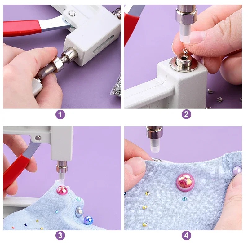 This versatile hand-press tool is designed for efficiently and accurately setting pearls onto fabric, leather, or other materials. It is ideal for DIY projects, clothing alteration, crafts, and embellishing accessories. The machine comes with multiple interchangeable abrasive tools (dies) to accommodate pearls of various sizes.