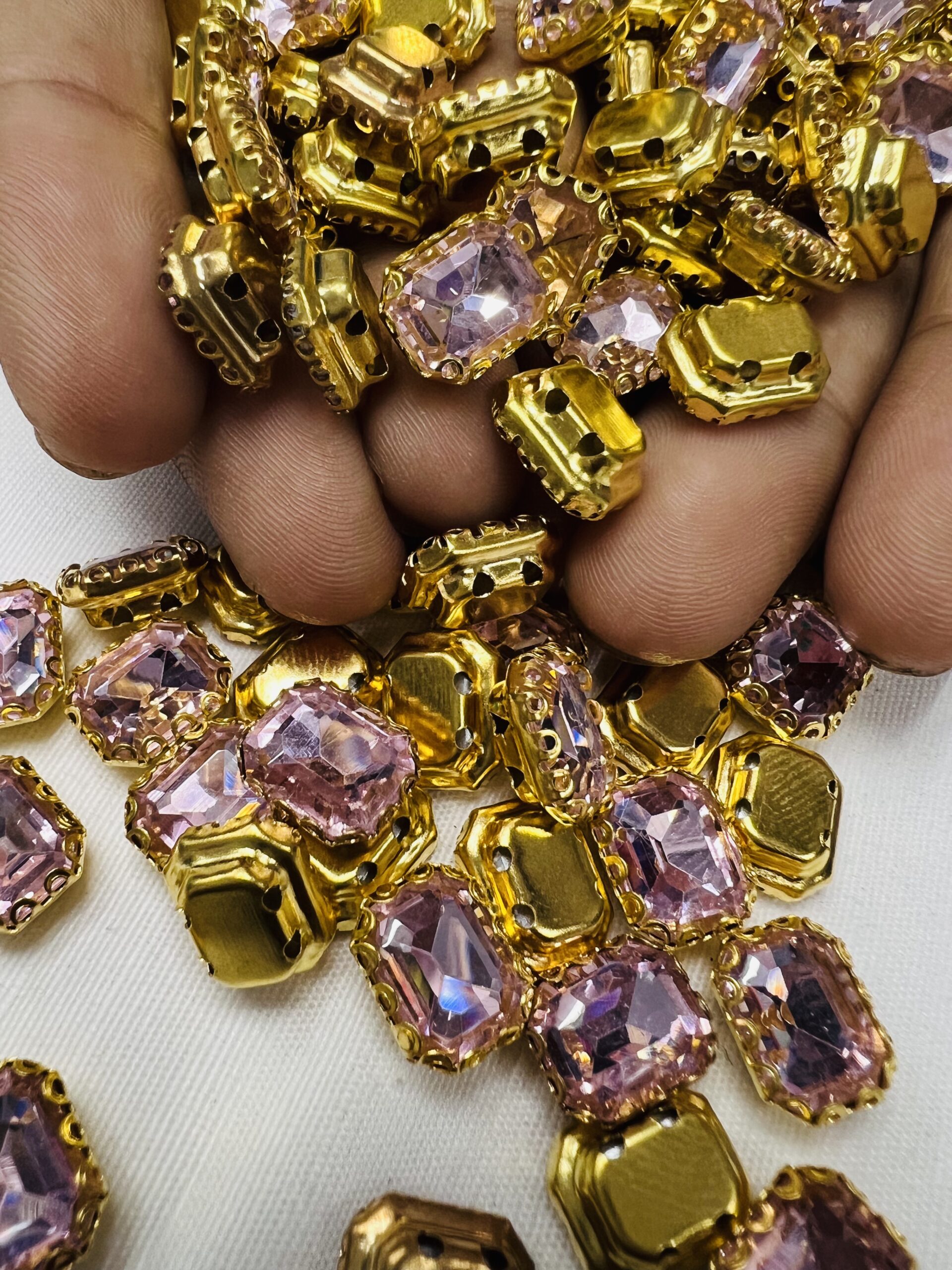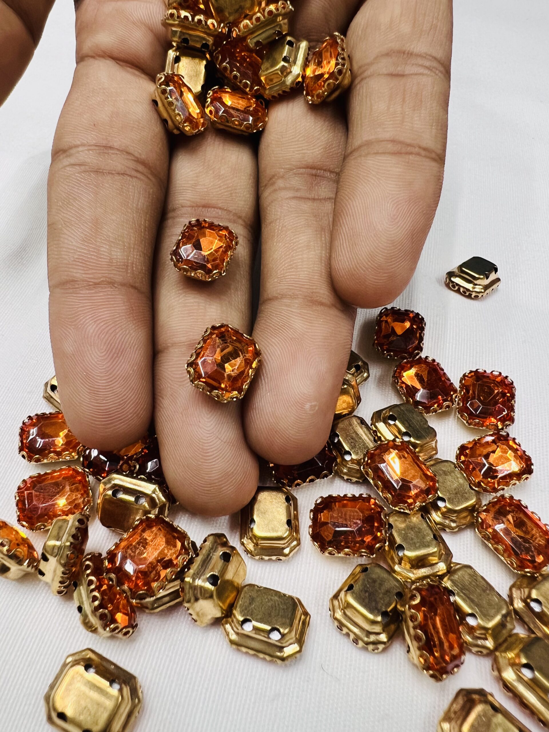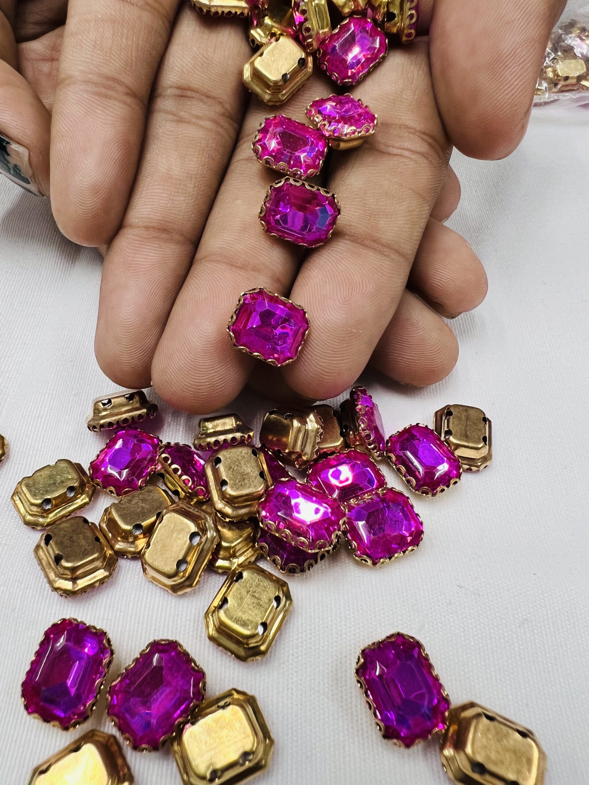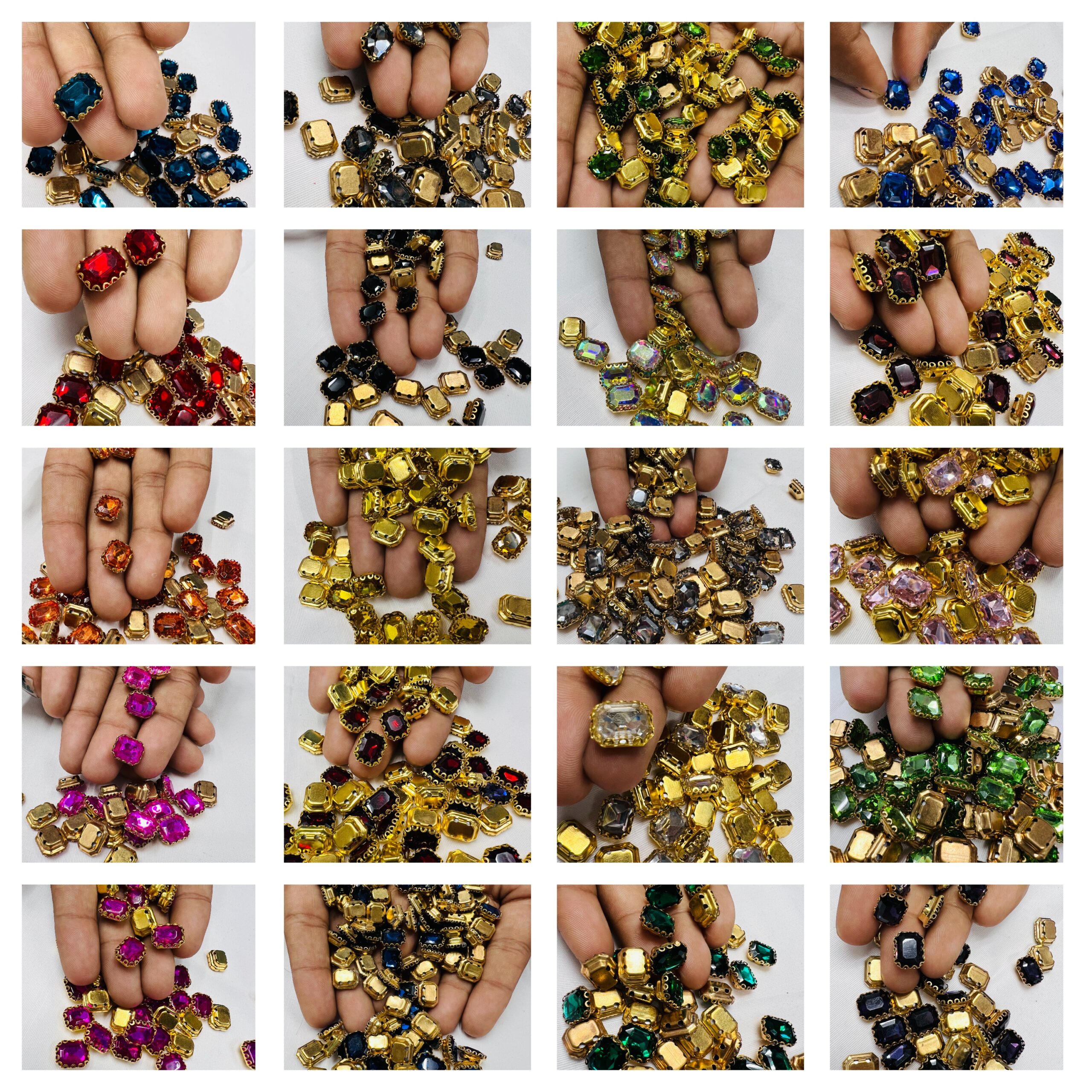 Upgrade your craftsmanship with our Rectangle Emerald-Cut Clip Stones. Specifically designed for high-end Aari embroidery and boutique jewelry making, these stones feature a sophisticated rectangular silhouette with faceted edges that capture light brilliantly. Each crystal is firmly gripped by a premium gold-toned metallic claw, ensuring both a luxurious aesthetic and a long-lasting hold on any surface.