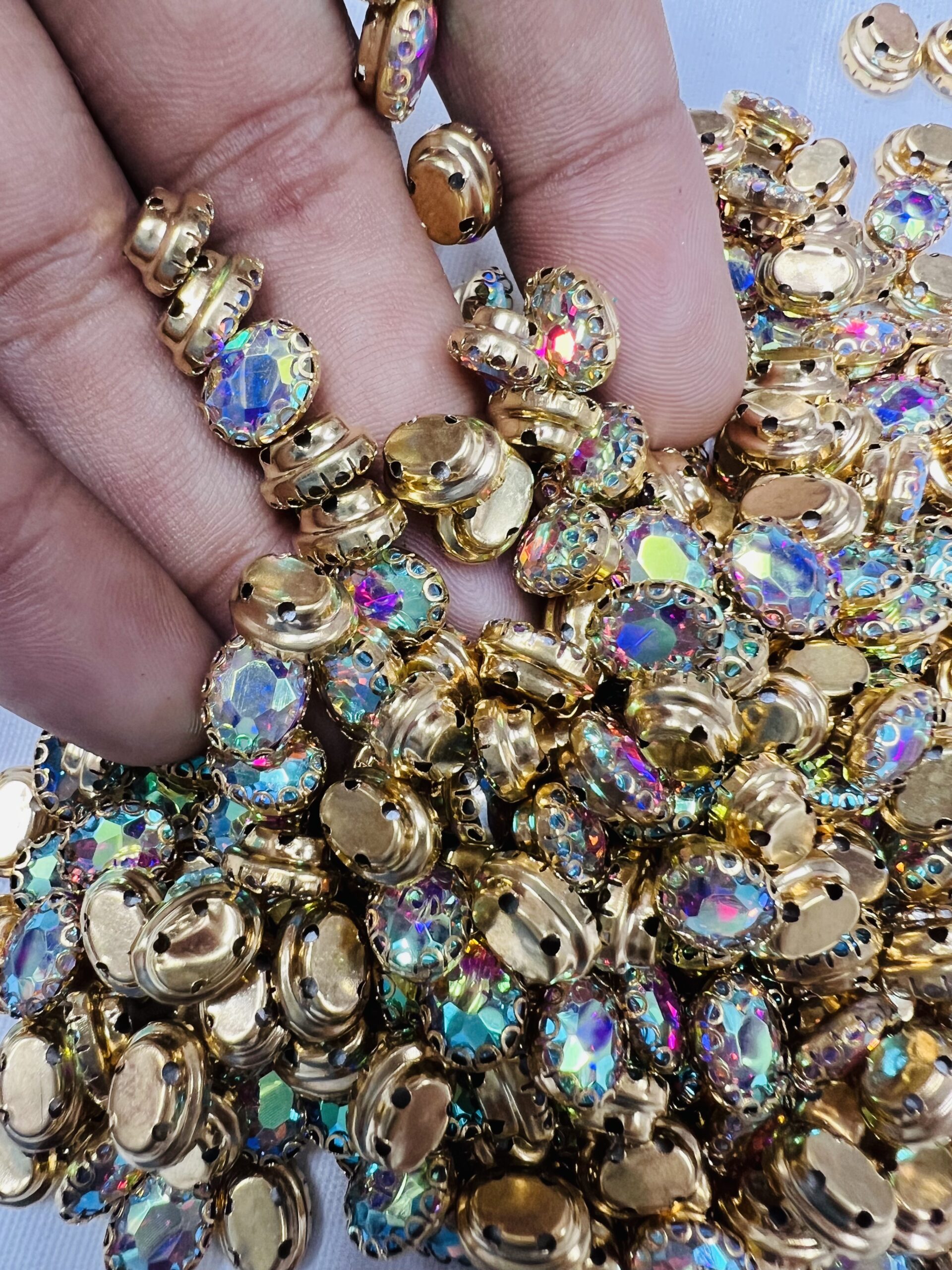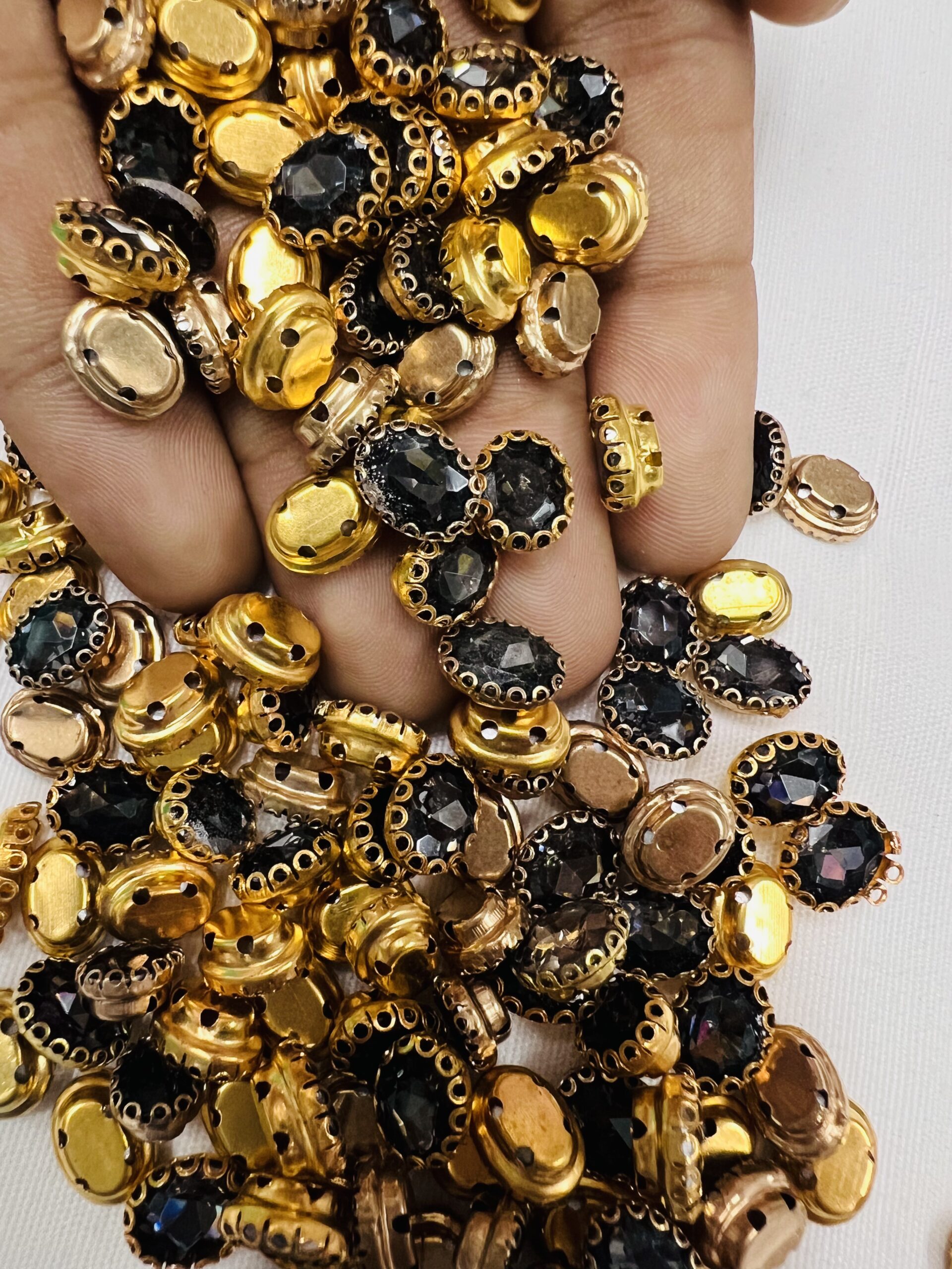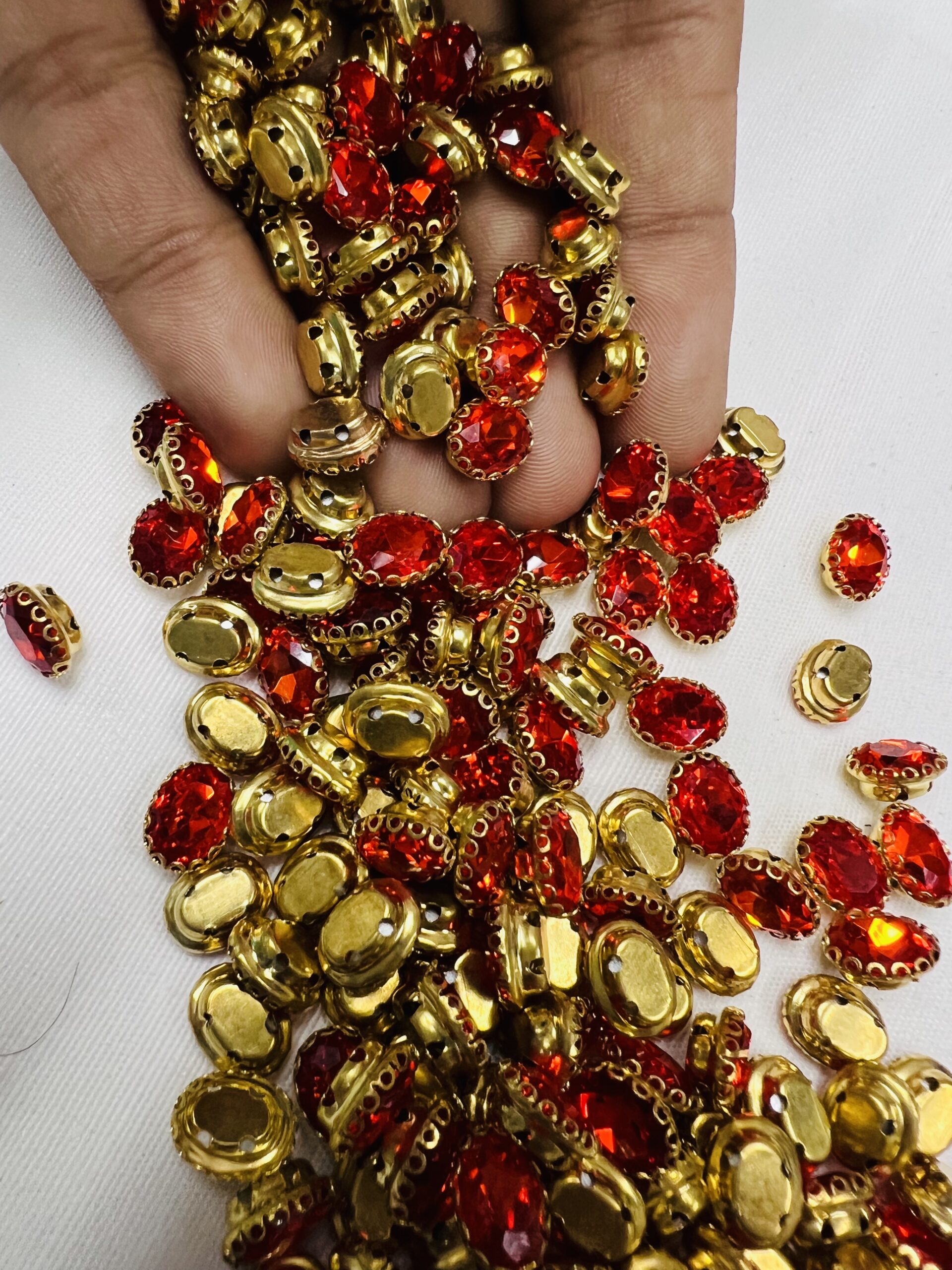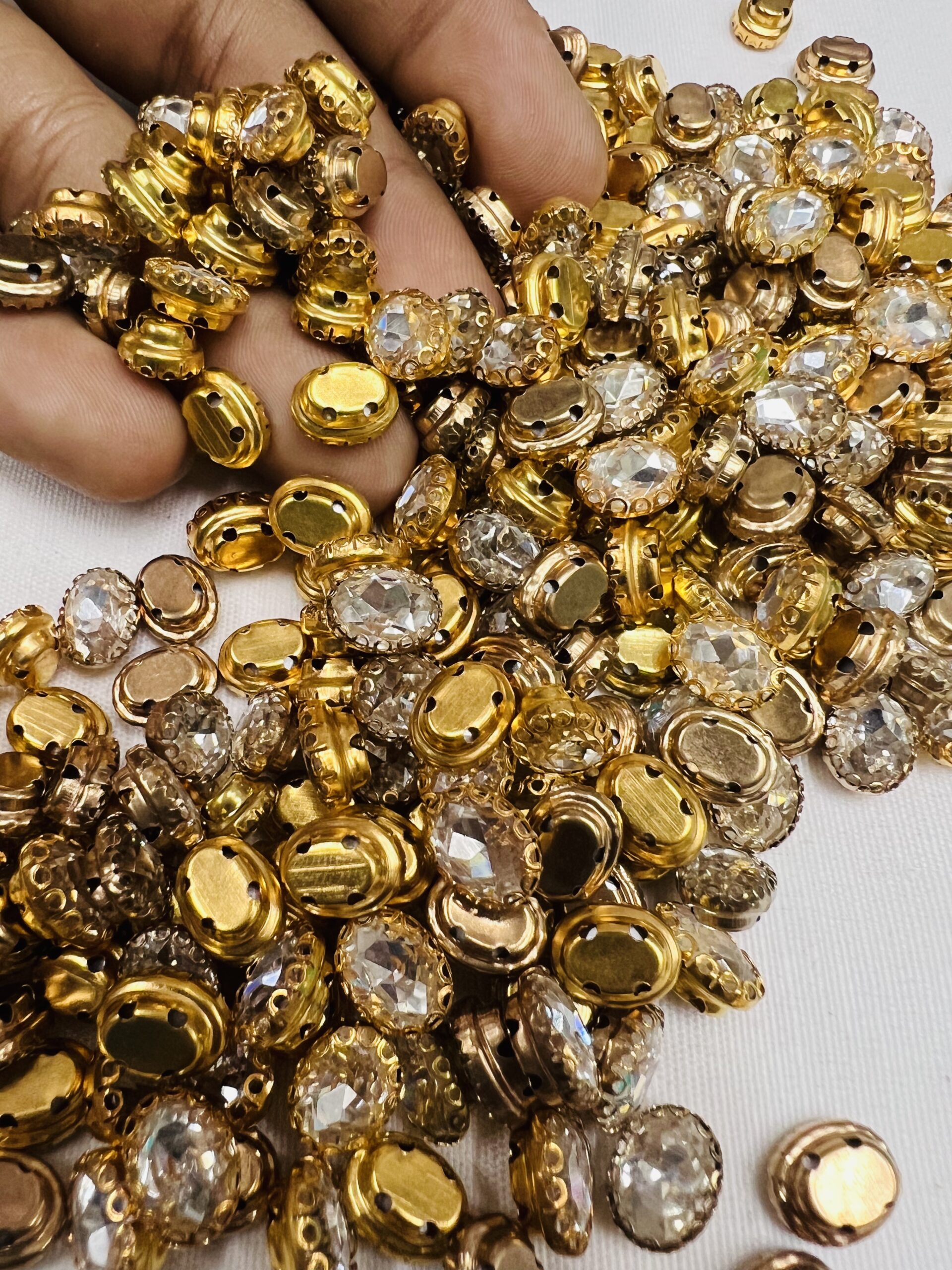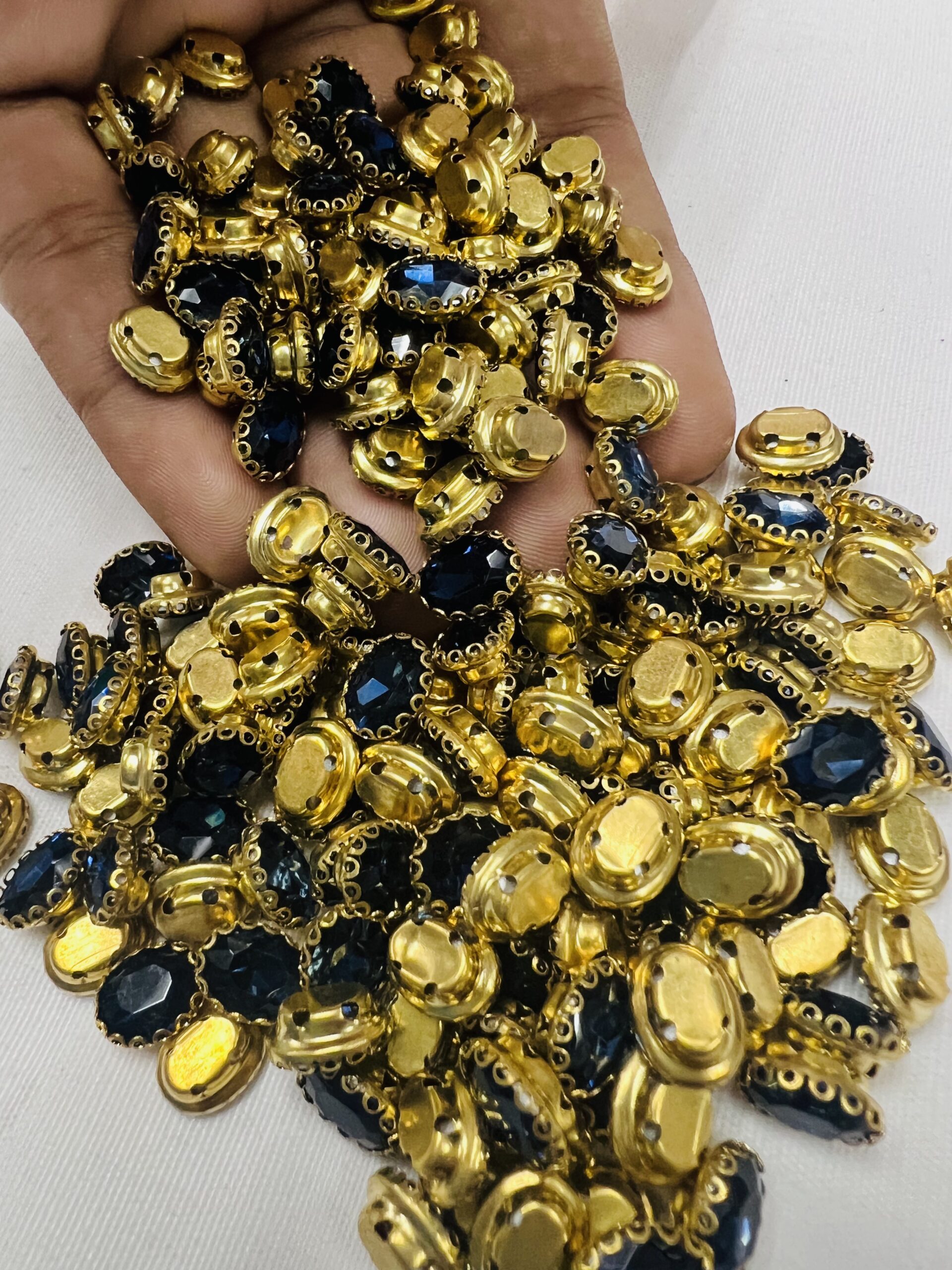 Tailor-made for the intricate art of Aari embroidery and handcrafted jewelry, these oval clip stones are a staple for every artisan’s kit. Each stone is encased in a high-shine gold-plated frame, providing the “lift” and definition required for traditional Zardosi and Maggam work. Whether you are detailing a bridal lehenga or crafting a statement necklace, these stones offer the perfect blend of traditional elegance and modern durability.