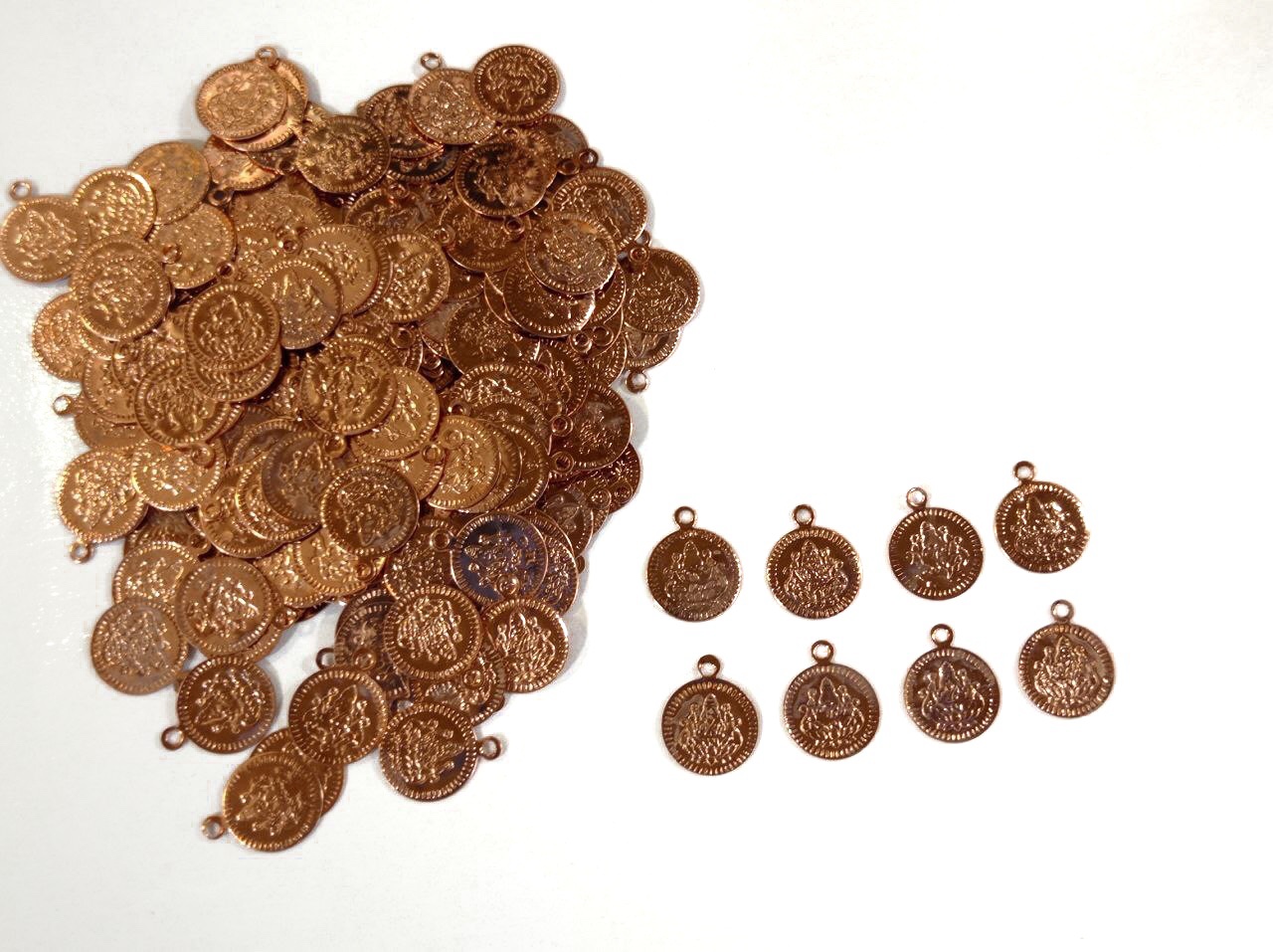 Add a touch of divine elegance to your creative projects with these exquisite rose gold-toned coin pendants. Traditionally known as “Kasas,” these coins feature intricate embossed detailing of Hindu deities, commonly used in traditional Indian jewelry like the Kasu Mala (coin necklace).