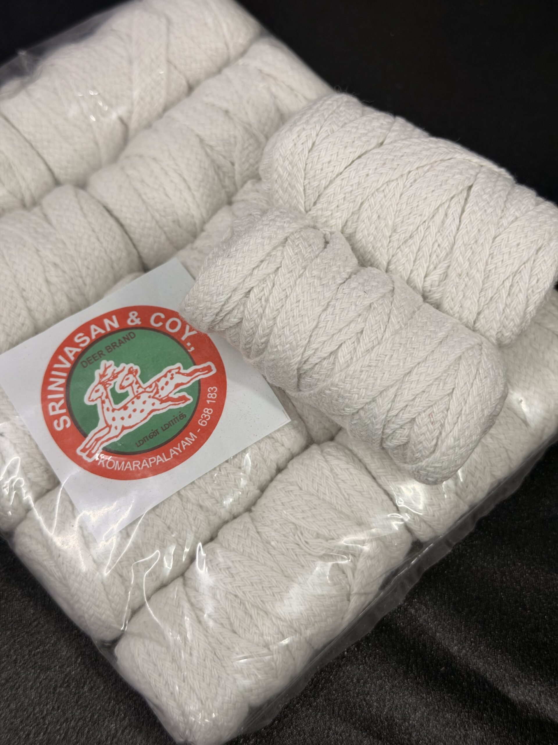 This pack contains 10 high-quality, hand-rolled white cotton bundles from the renowned Srinivasan & Coy (Deer Brand). Originating from Komarapalayam, these wicks are crafted from pure, absorbent cotton designed for a steady, long-lasting flame. Whether used for traditional oil lamps (diyas), spiritual ceremonies, or general household lighting, these bundles offer a clean burn with minimal soot. The thick, braided texture ensures excellent oil absorption and durability.