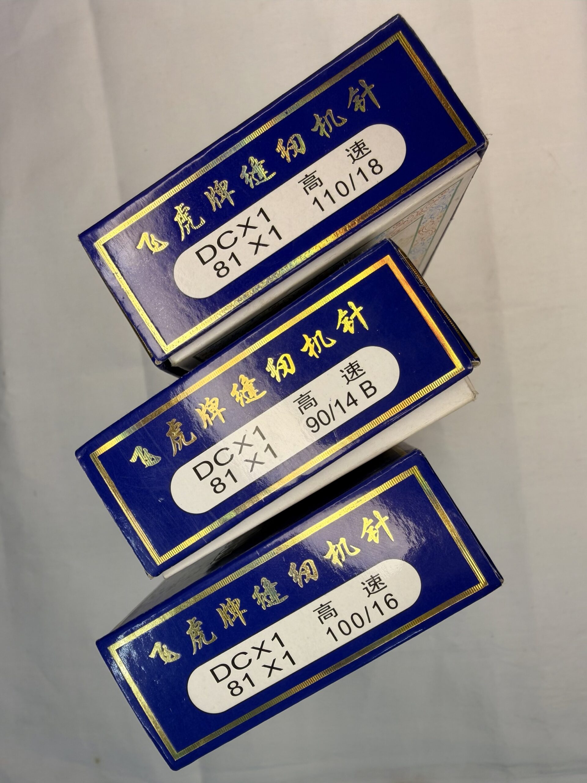 This listing features genuine Flying Tiger brand industrial sewing machine needles, specifically designed for high-speed industrial applications. The needles utilize the DC x 1 system (also known as 81 x 1), a common system used in industrial machines like overlockers or blindstitch machines. The size is 100/16 (Metric 100, US/Singer 16), which is a medium-to-heavy gauge suitable for sewing medium-weight materials, denim, canvas, upholstery fabrics, and general goods requiring a stronger needle. The Chinese characters (高速) on the label confirm they are for “High Speed” operation.