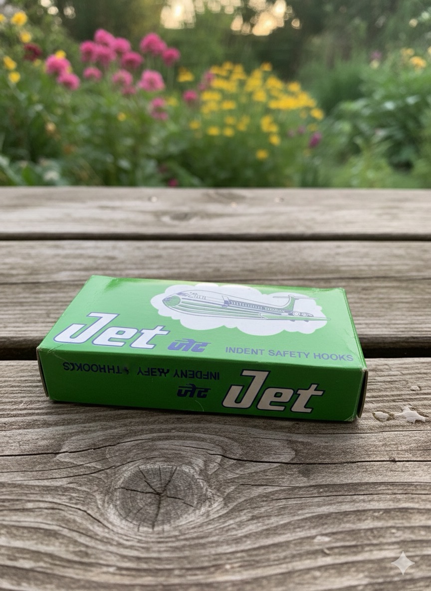 This product is a box of Jet INDENT SAFETY HOOKS. The packaging is a vibrant green and features a graphic of a streamlined jet airplane, reflecting the brand name “Jet” (written in both English and what appears to be Hindi/Devanagari script: “जेट”). These “Indent Safety Hooks” are a type of fastener, likely similar to standard safety hooks or dress hooks, used in sewing, tailoring, or other crafts where a secure closure is needed. The “indent” feature suggests a specific design for improved hold or ease of application.( 15 Packs in box and 100 hooks in each pack )