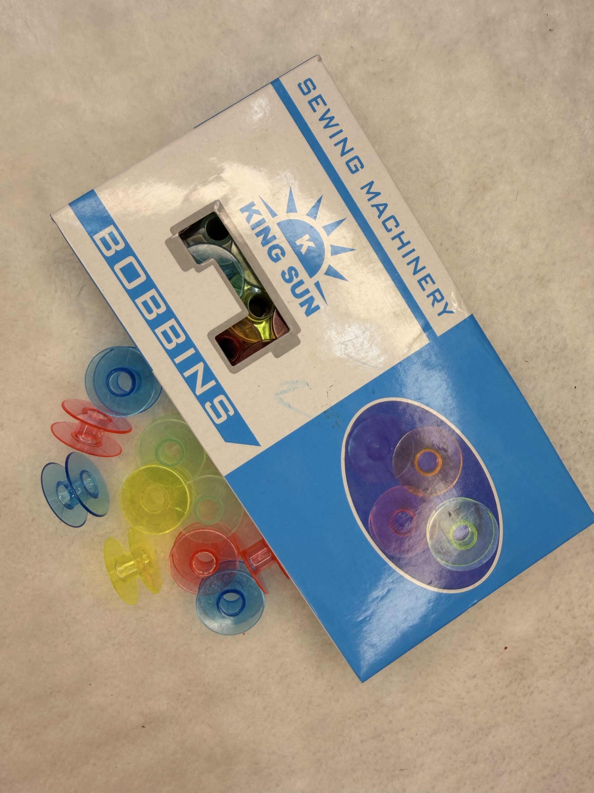A box of KING SUN Sewing Machinery Bobbins containing multiple clear, colored plastic bobbins. The bobbins are visibly scattered outside the box and are featured in various colors, including blue, red, yellow, and green. Plastic bobbins are lightweight and often used in various sewing machine models, particularly those with a drop-in bobbin system. The different colors can be very useful for organizing different thread colors, allowing the user to quickly identify the thread wound on the bobbin without unwinding it.