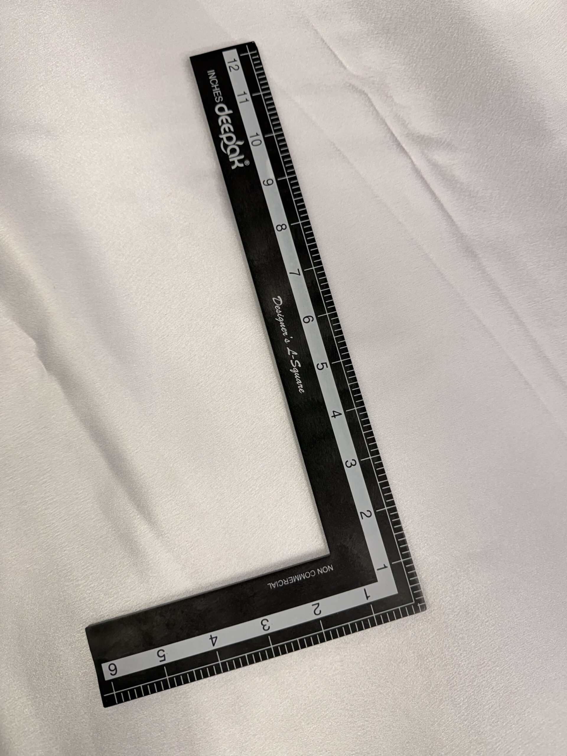This is an image featuring a black L-Square ruler (also known as a set square or tailor’s square) placed on a white, satin-like fabric. The tool is clearly marked in inches and is designed specifically for drafting, pattern-making, and measuring 90-degree angles in design or tailoring projects. The label indicates it is a “Designer’s L-Square” and is marked “NON COMMERCIAL.”