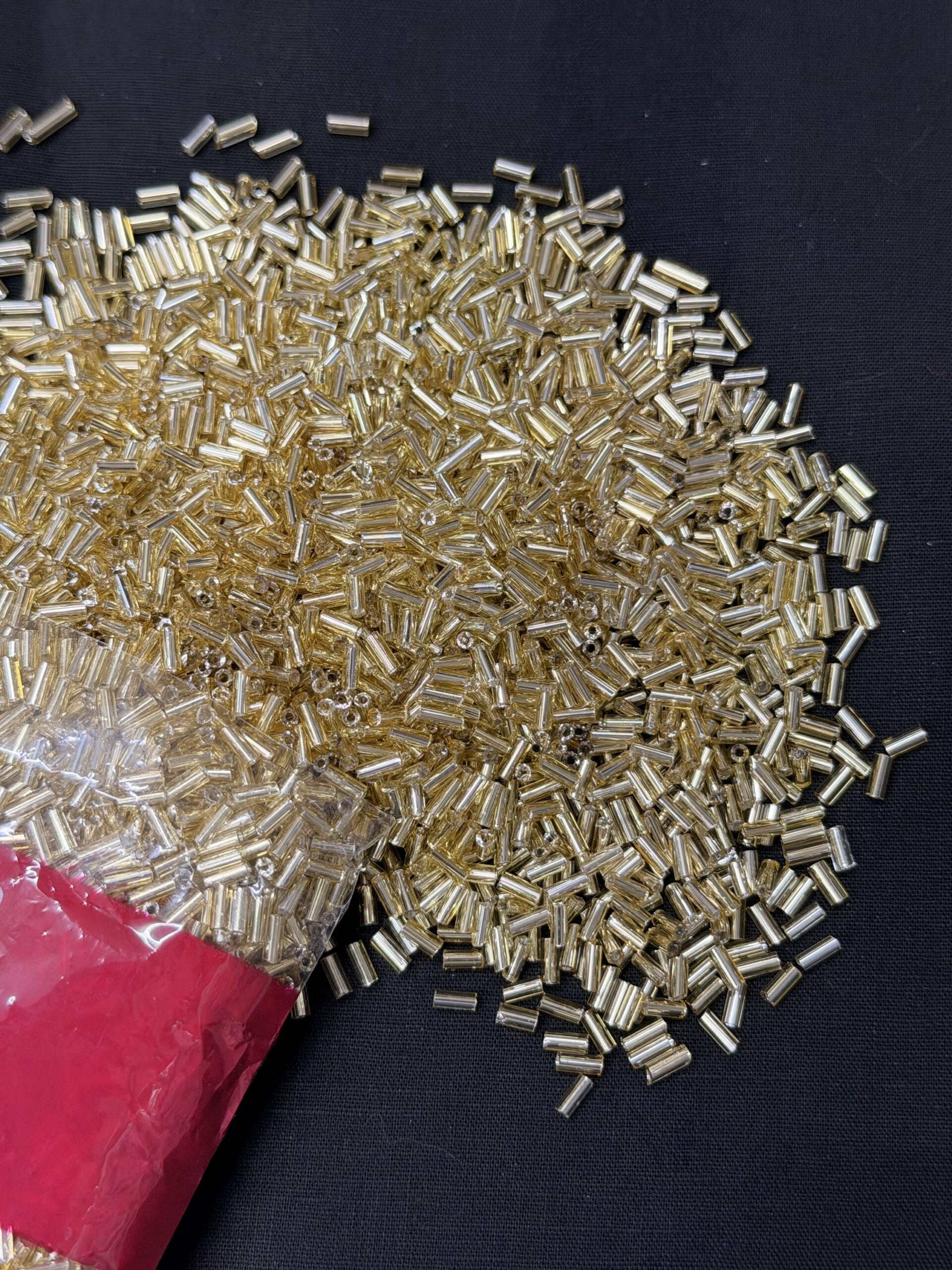 These high-quality glass tube beads, known as Cut Dana or Nalki, are precision-crafted for professional Aari, Zardosi, and Maggam embroidery. This collection offers a variety of finishes—from high-shine gold and silver to sophisticated matte silver—to provide the perfect texture for any couture design.