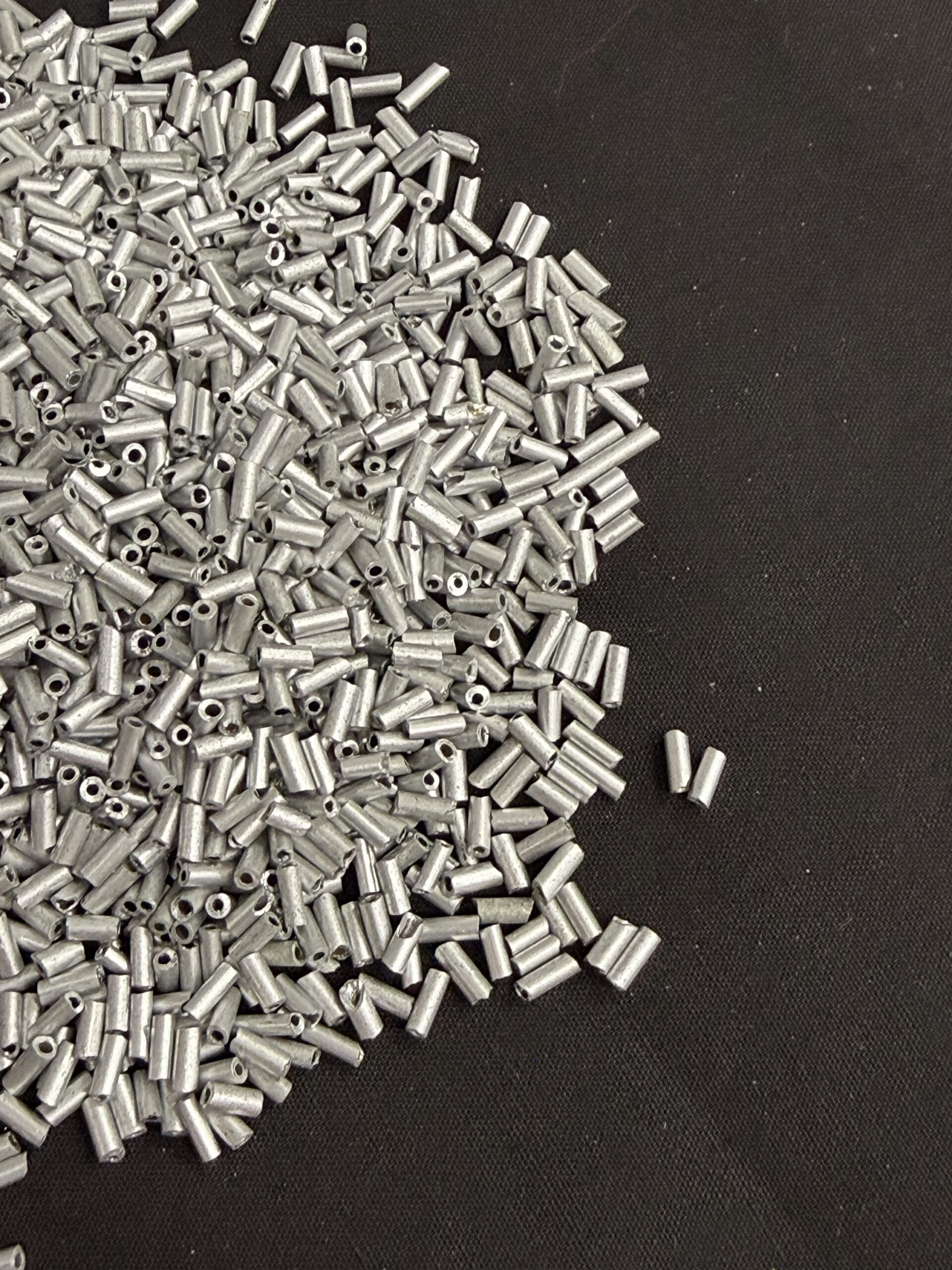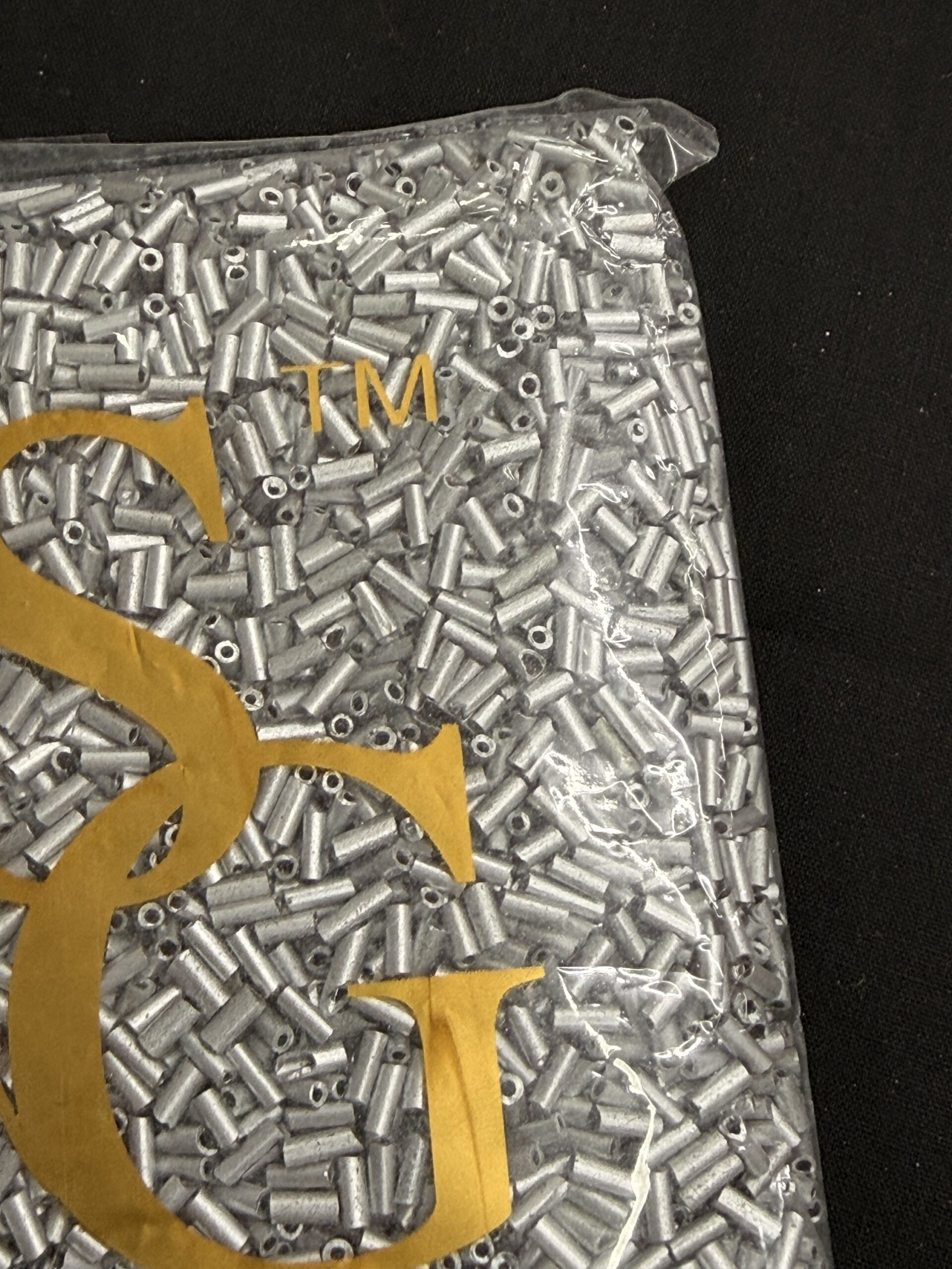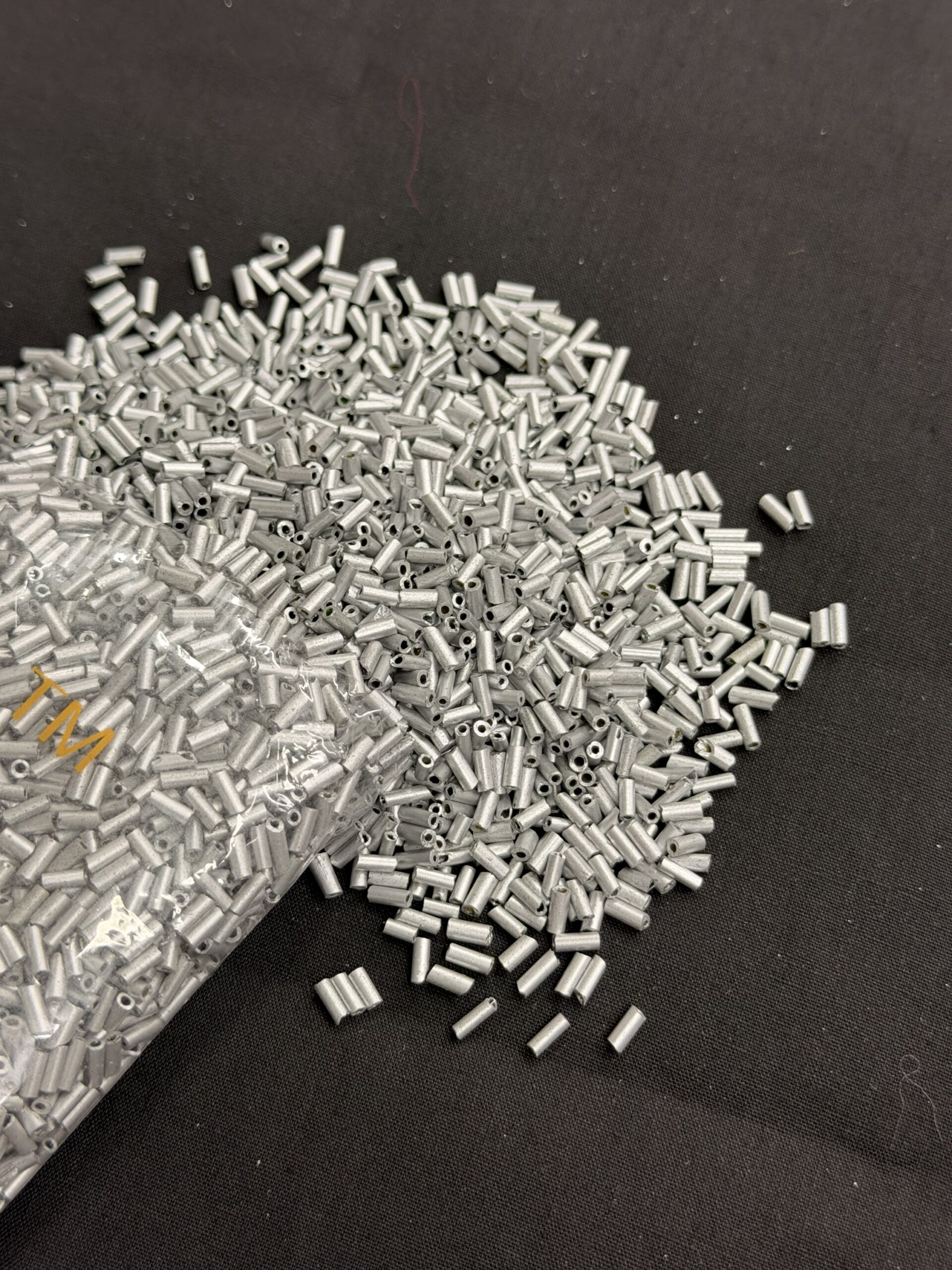 These two images showcase the essential variety of Cut Dana (short tube beads) used in professional Aari and Zardosi embroidery. By combining the high-shine silver-lined beads with the sophisticated matte silver beads, you can create stunning depth and contrast in your