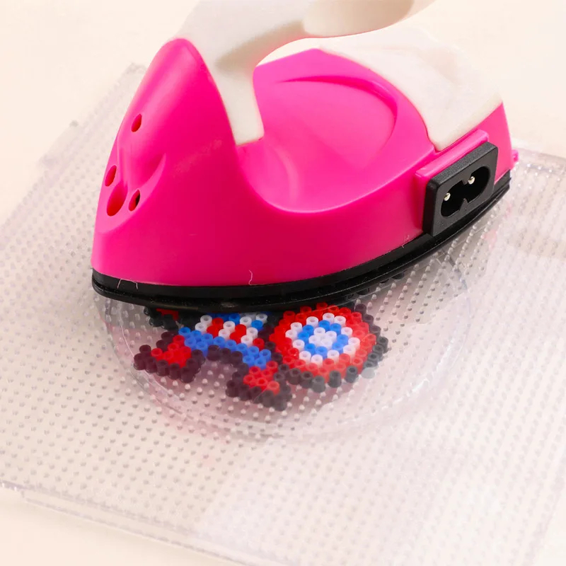 This is a compact and portable Mini Electric Iron, perfect for various crafting projects like bead melting, iron-on patches, fusible interfacing, or for quick touch-ups on clothes while traveling. Its small size makes it easy to handle for detailed work. The iron comes in a vibrant pink color and is packaged in a small, colorful box. It includes a power cord with an inline on/off switch for convenient use.