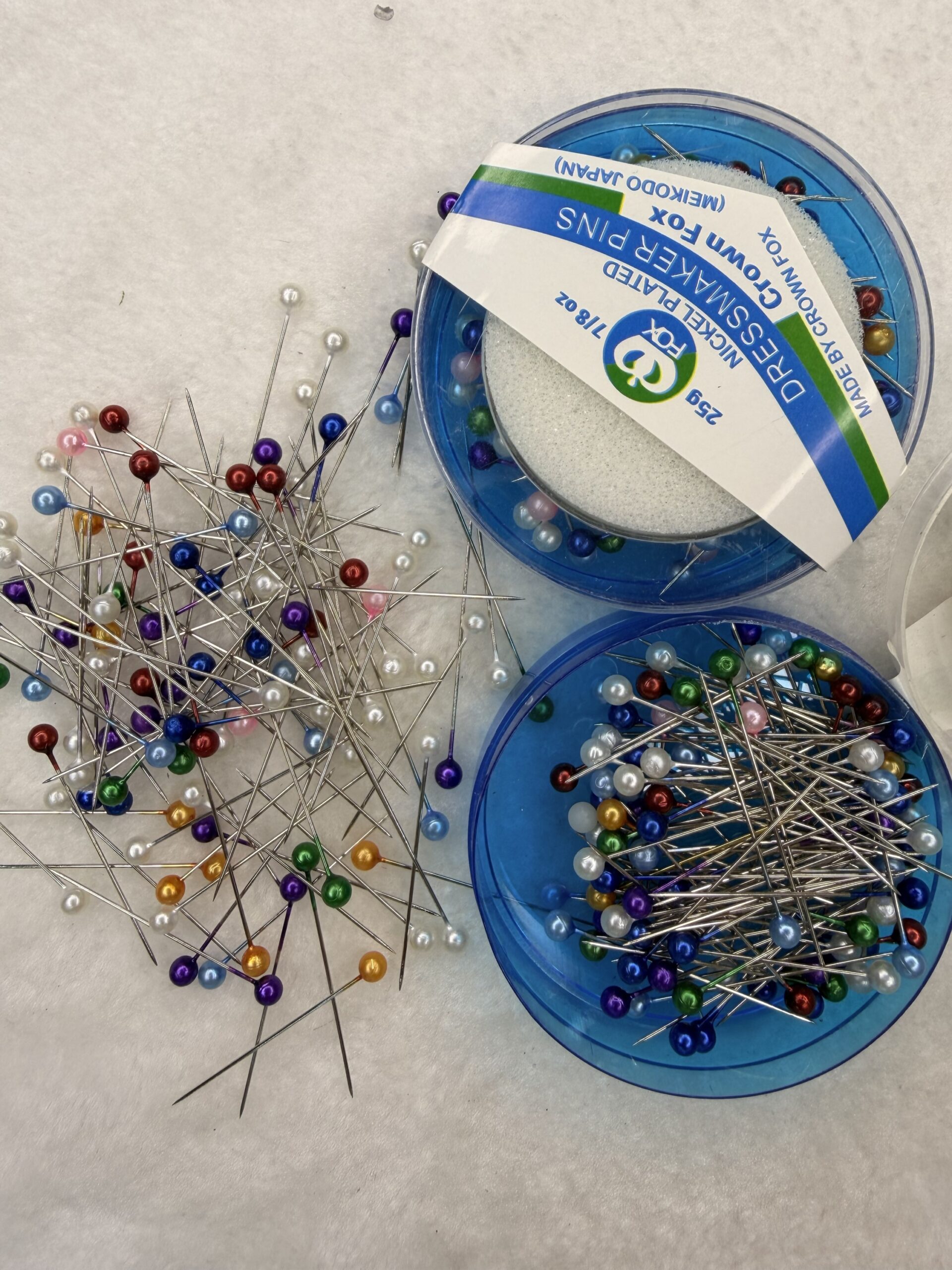 • The first image shows Crown Fox Dressmaker Pins, labeled as Nickel Plated and manufactured by Meikodo (Japan). These are packaged in blue circular containers.