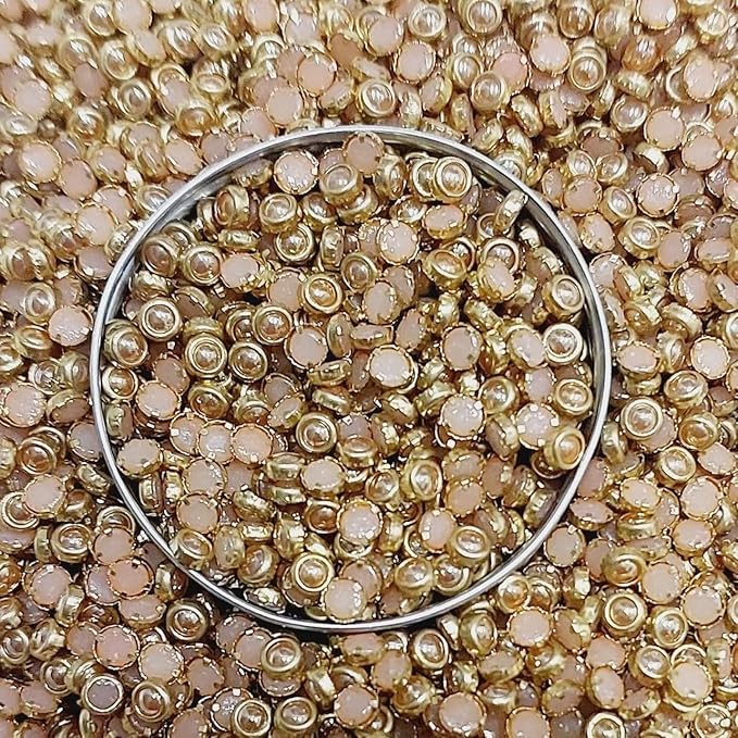 Elevate your creative projects with our exquisite Peach Kundan Stones. These high-quality, flat-back crystals feature a soft peach hue encased in a delicate gold-toned metal rim, providing a sophisticated 3D effect to any design. Perfect for artisans specializing in Aari embroidery, Magagam work, or DIY jewelry, these stones offer a brilliant shine that mimics traditional Indian jewelry. Whether you are embellishing a bridal lehenga or crafting custom earrings, these durable and vibrant stones ensure a professional, high-end finish.