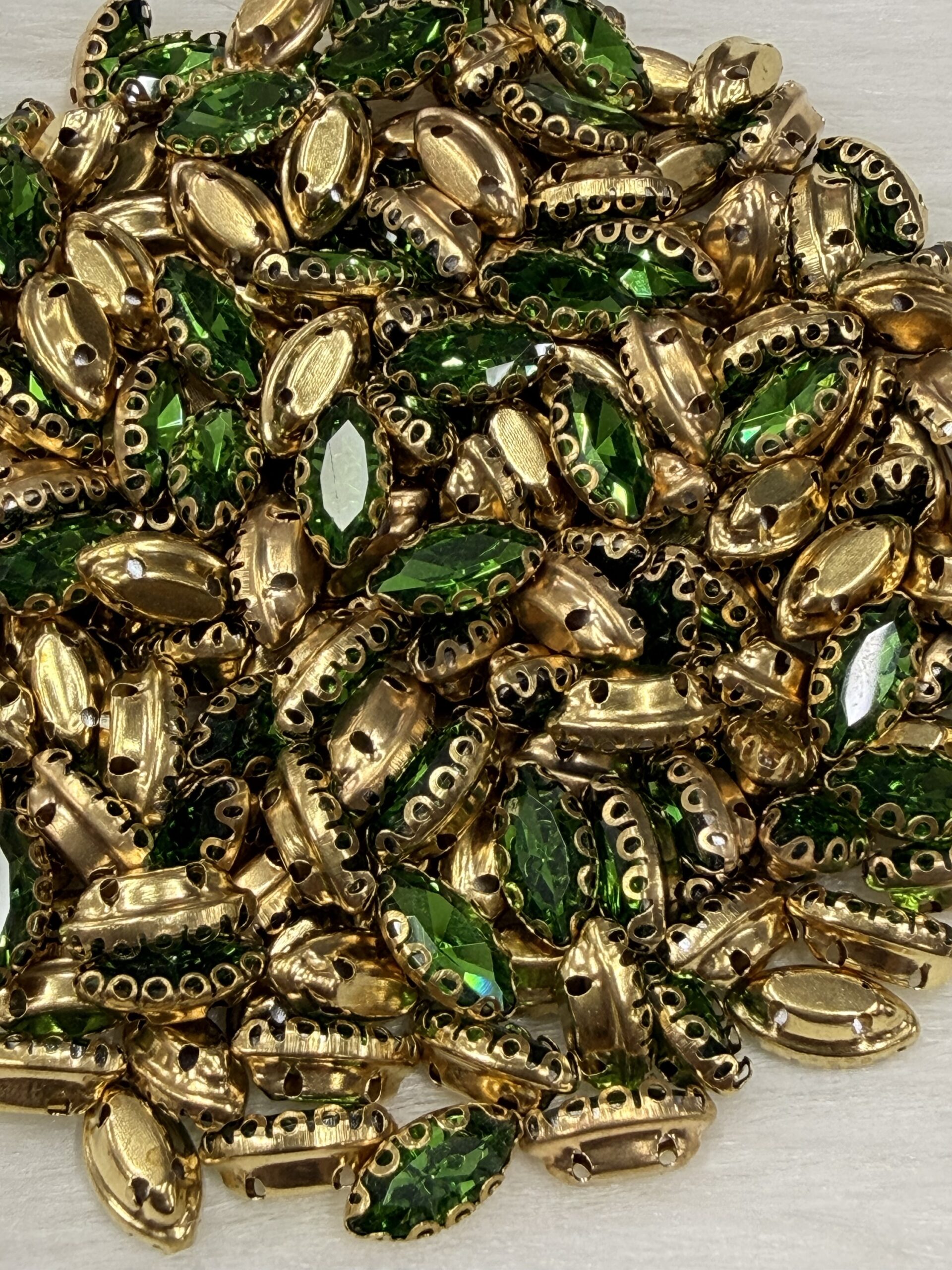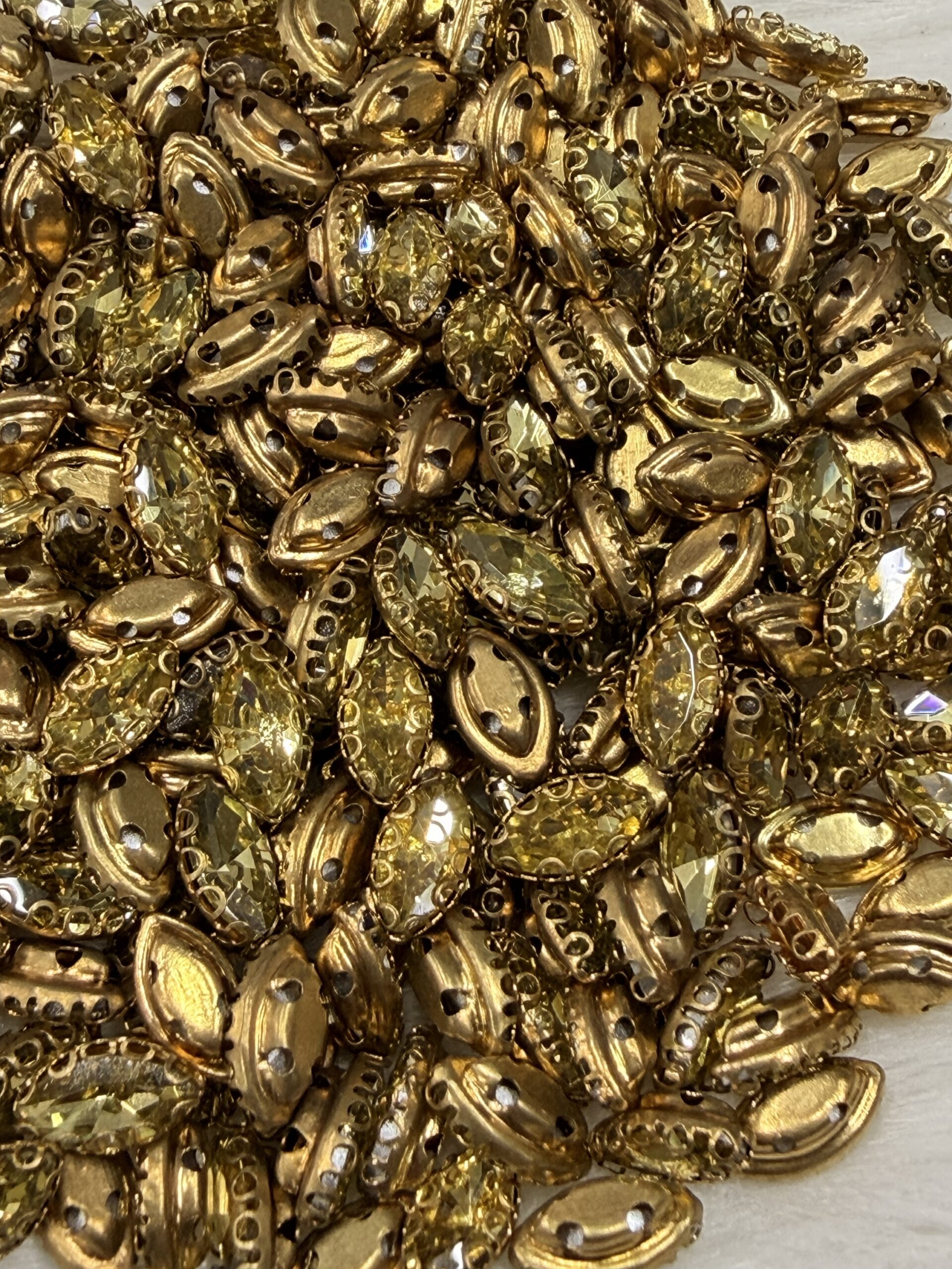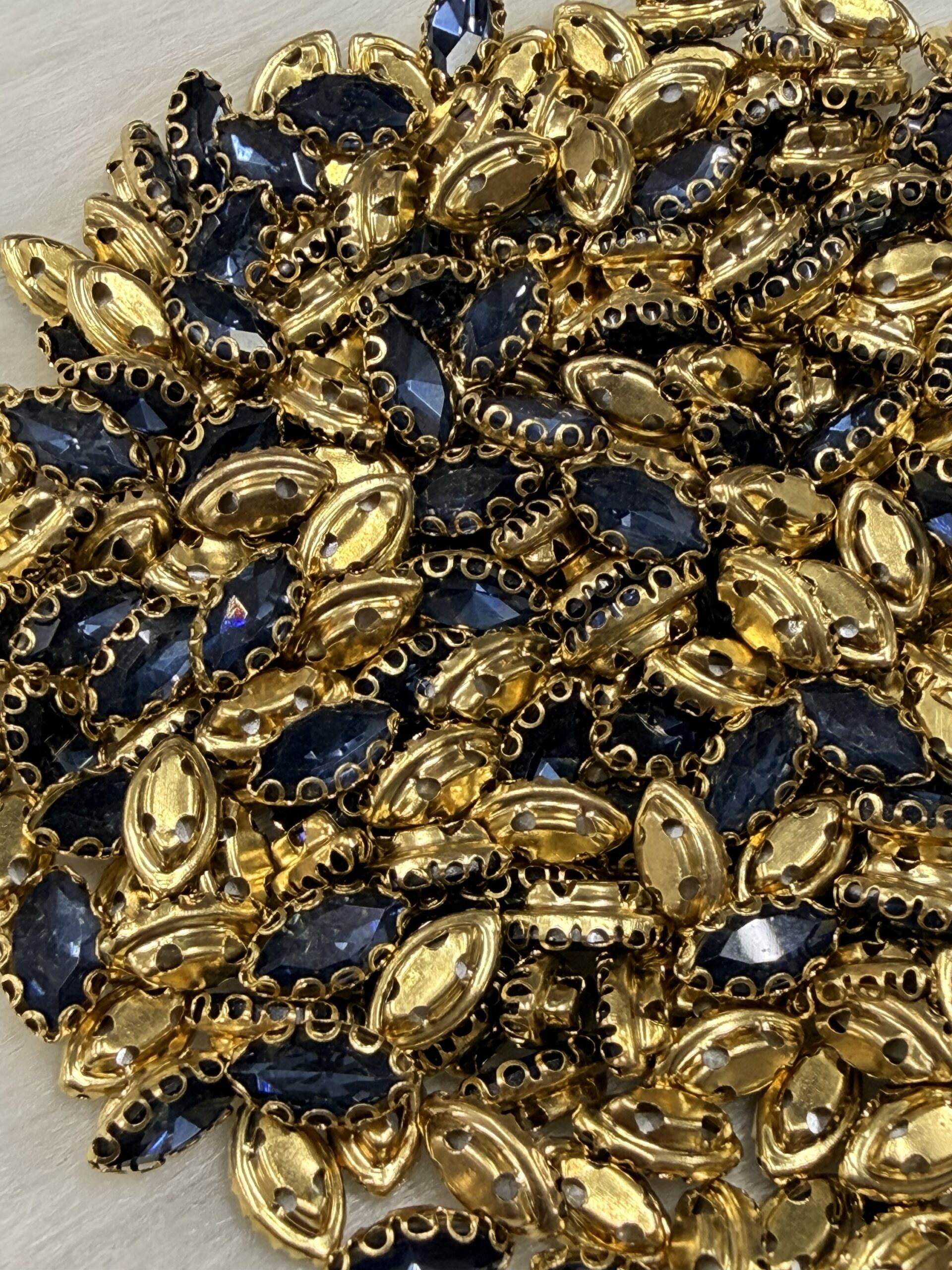 This comprehensive collection of premium clip stones (claw-set crystals) is precision-engineered for the high-detail world of Aari embroidery, Maggam work, and fine jewelry making. Each faceted glass crystal is securely housed in a decorative gold-toned metallic “clip” that provides the necessary elevation and structural integrity for professional zardosi and handcrafted designs.