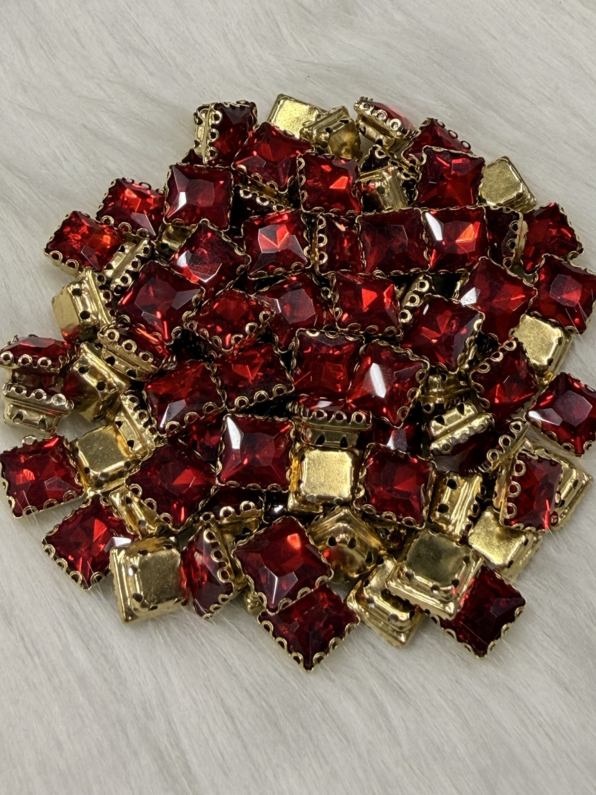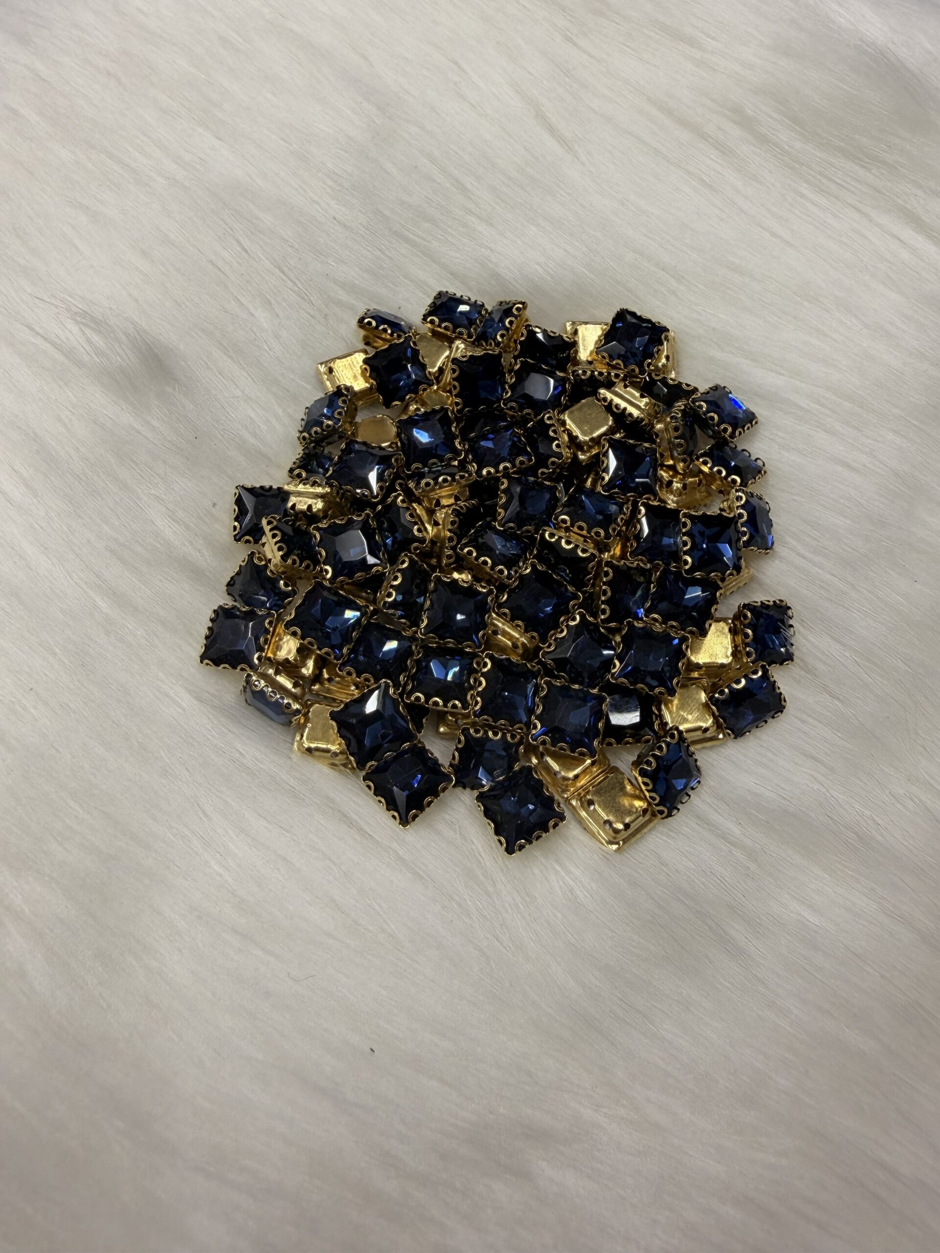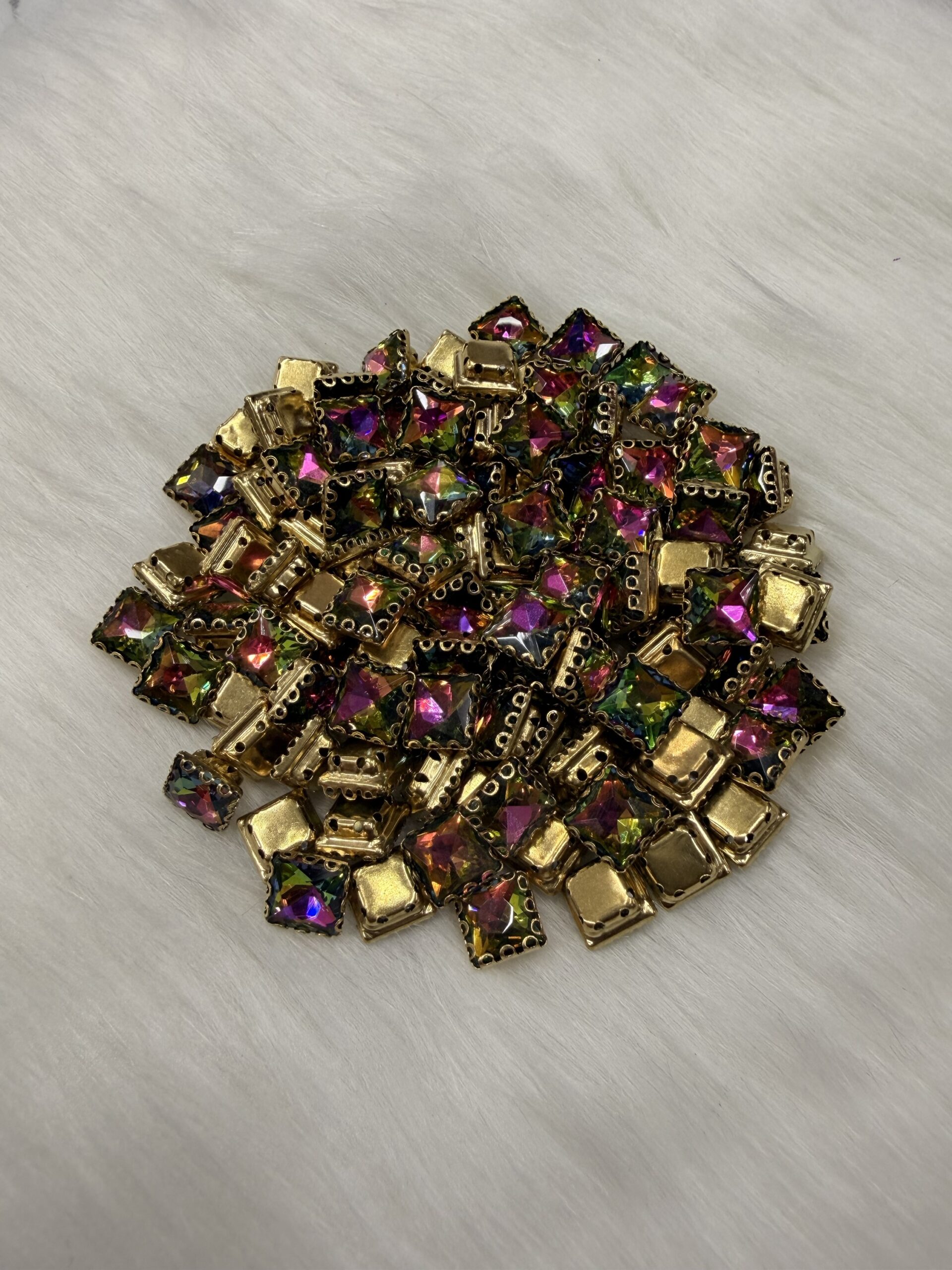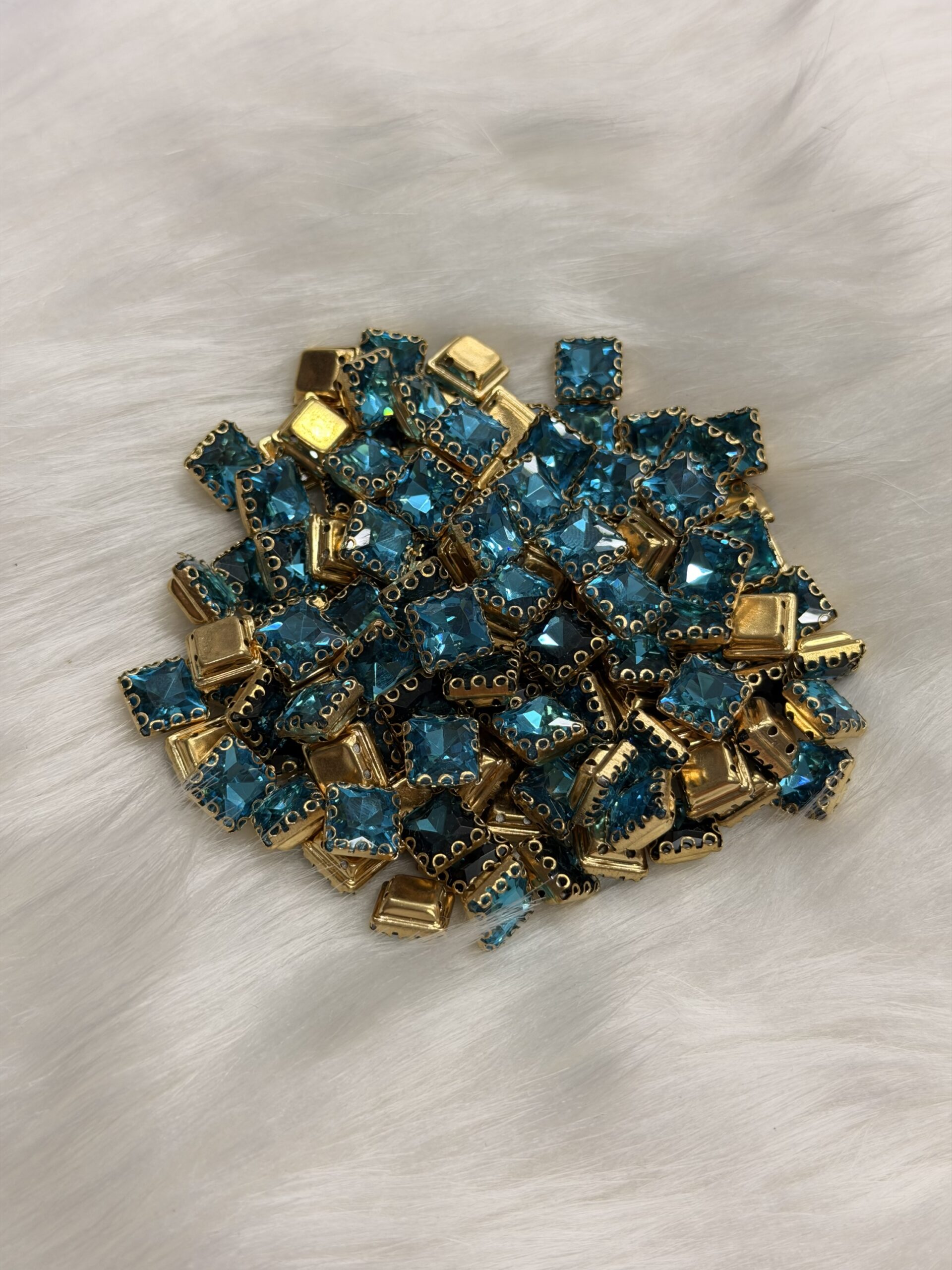 This premium collection of clip stones (claw-set crystals) is specifically curated for the intricate demands of Aari embroidery, Maggam work, and high-end jewelry making. Each faceted glass crystal is precision-set into a gold-toned metallic base, providing the necessary elevation and structural integrity for professional Zardosi and traditional hand-crafting.