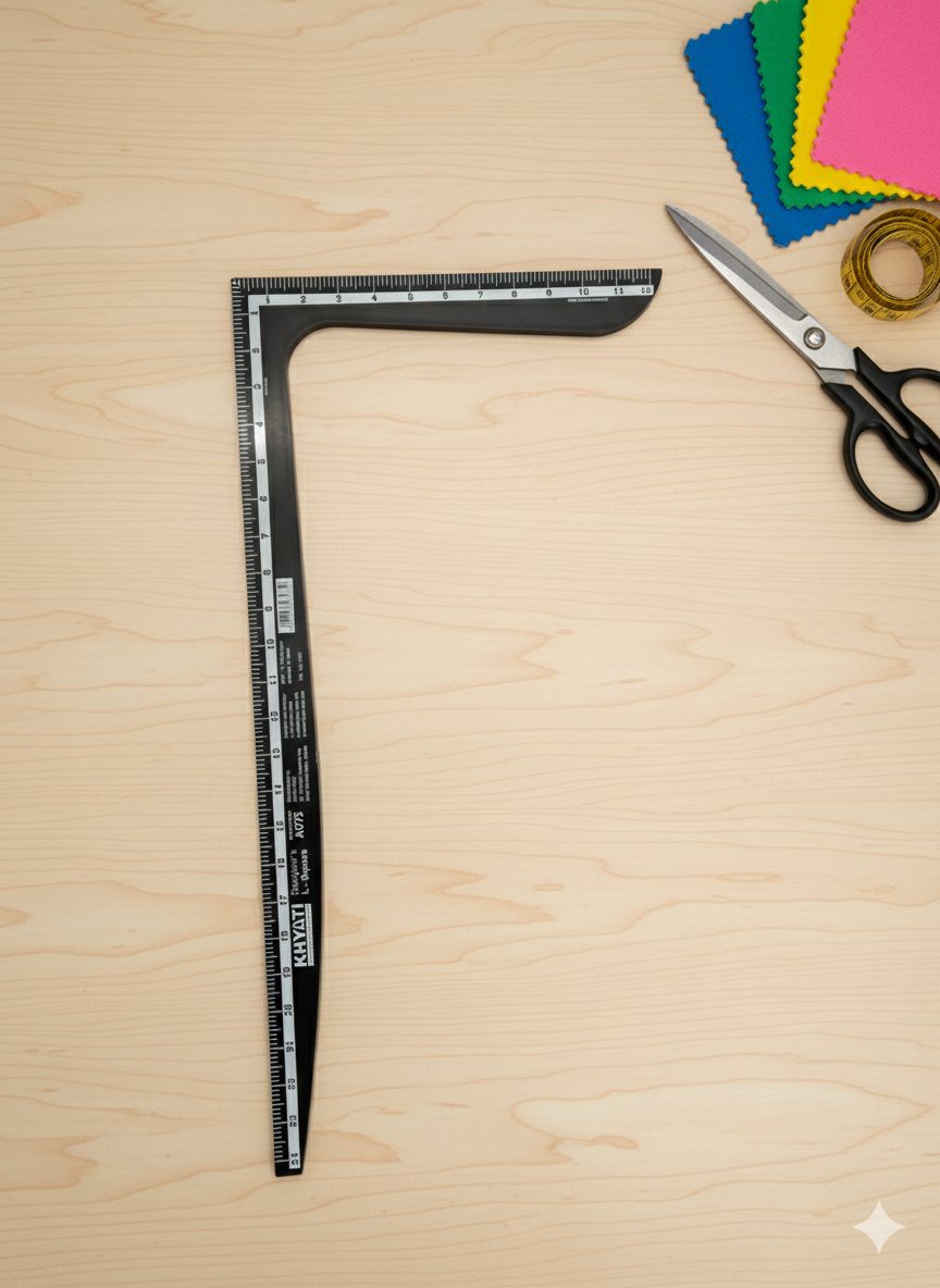 The KHYATI Designer’s L-Square (Product Code: A075) is a fundamental precision tool for fashion design, pattern drafting, and professional tailoring. This versatile “L” shaped ruler allows for the simultaneous measurement of length and width while ensuring perfectly perpendicular 90-degree angles. Featuring a sleek black finish with high-contrast white markings, this designer-grade tool provides exceptional clarity on all fabric types, making it essential for creating accurate pattern foundations, necklines, and hem adjustments.