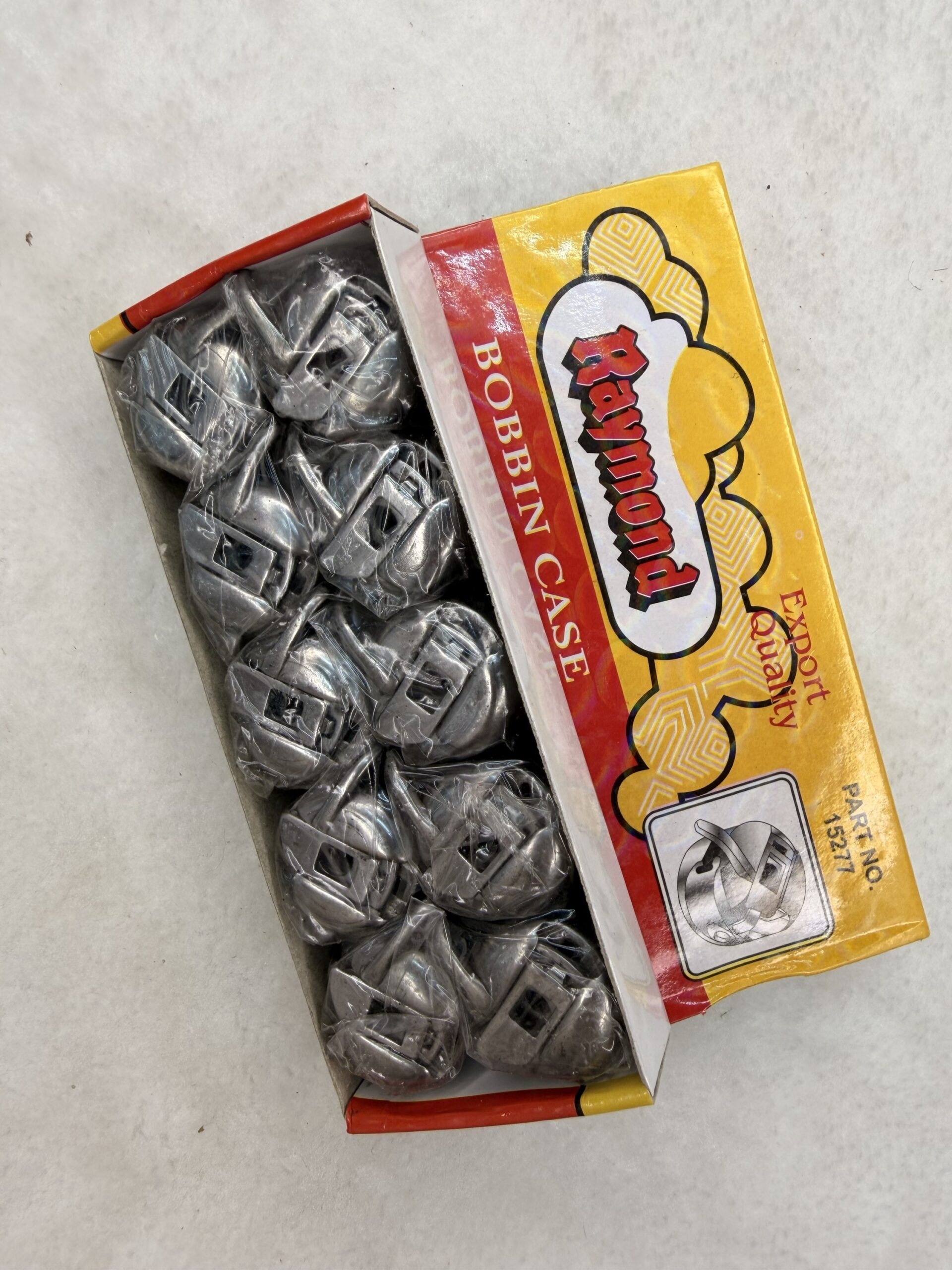 The product is a pack of metal bobbin cases, identified by the part number 15277. The cases are individually wrapped inside a distinctive yellow and green box . The bobbin case is a critical component for a sewing machine, holding the bobbin and regulating the lower thread tension to form a lockstitch. The “Export Quality” label suggests a high standard of manufacturing and durability .