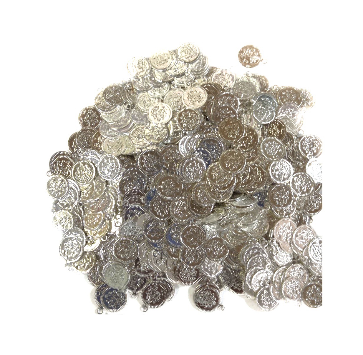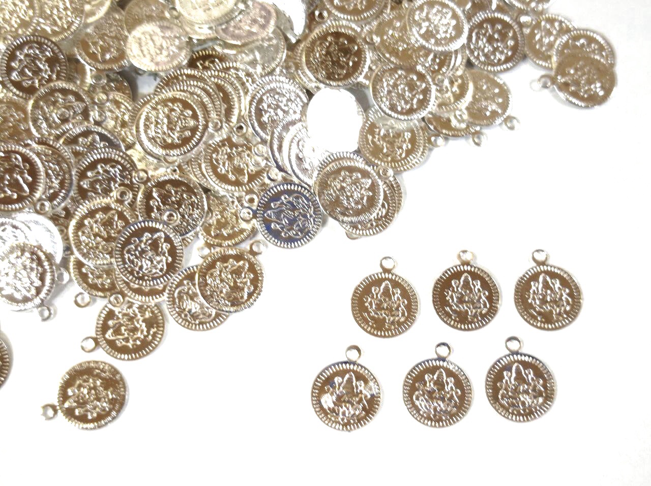 Elevate your creative designs with these stunning silver-plated coin pendants. Known in traditional Indian jewelry as “Kasas,” these coins feature a detailed relief of a deity, often representing prosperity and grace.