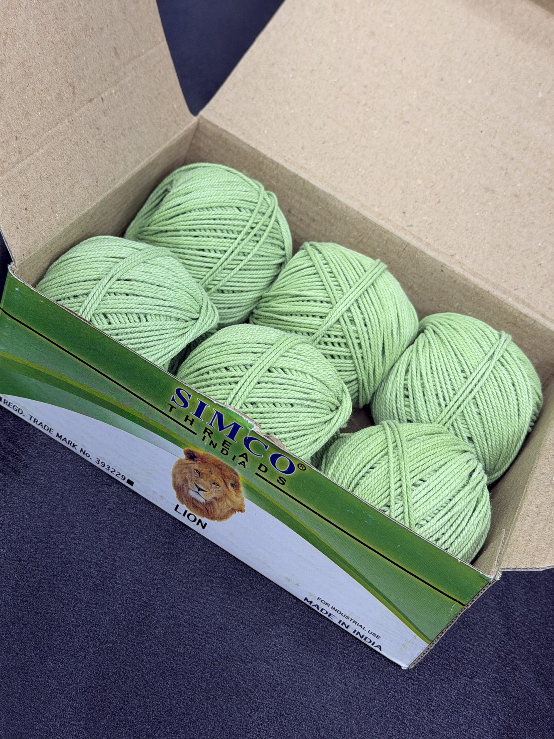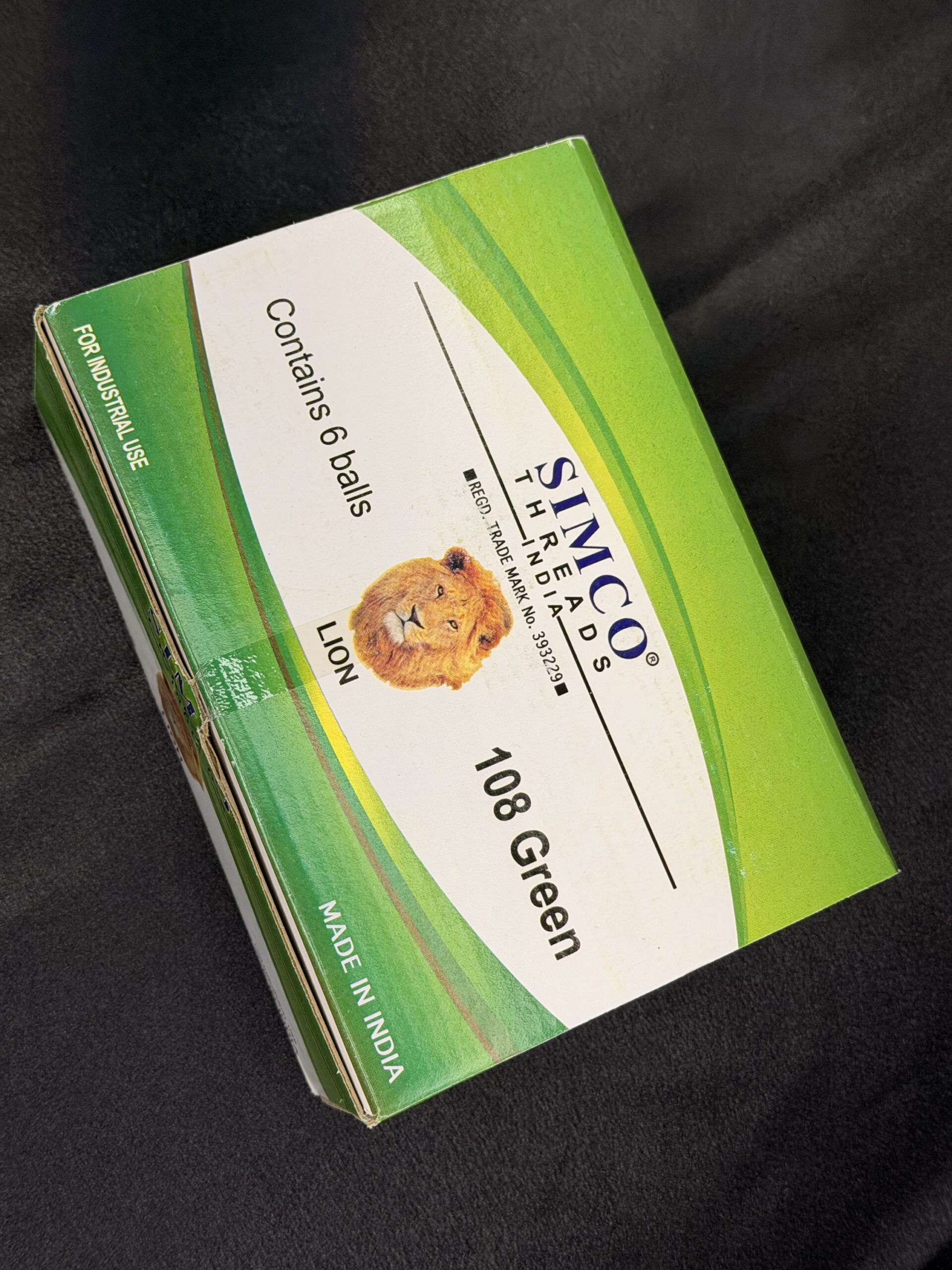This is a bulk package of SIMCO Threads India industrial-grade sewing thread. This specific “Lion” brand variant is known for its durability and is designed specifically for high-volume industrial use. The box contains 6 individual balls of thread in a vibrant 108 Green shade. Manufactured in India, these threads are engineered to withstand the high speeds and tensions of industrial sewing machinery.