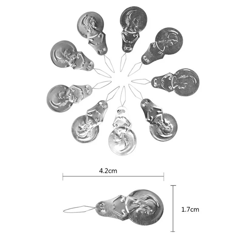 This classic, reliable tool is a fundamental accessory for any sewing basket. Made from sturdy, silver-toned metal, this threader features a thin wire loop that easily passes through the eye of a needle. Simply thread your yarn or floss through the wire loop, then pull the entire threader back through the needle eye to effortlessly complete the threading process. The body features a decorative embossed animal (likely a deer or ram) design, making it easy to grip and a charming piece of traditional sewing equipment.