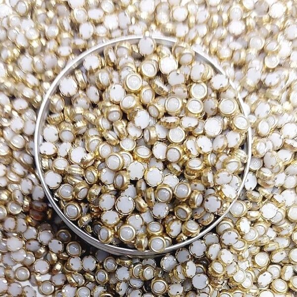 Premium White Glossy Kundan Stones with Gold-Toned Border(Round Shape) (Pack of 50g) – 3mm